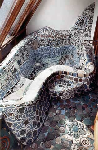 Composed of thousands of handcarved tiles, this hot tub holds about 450 gallons (1800 liters) of water. The water is kept clean, not with a chlorine system but with ultraviolet light and hydrogen peroxide. This keeps chemicals to a minimum and eliminates odors. As an alternative method of sanitizing, it requires more continuous maintenance. It was cloned after the Japanese heath spa Ten Thousand Waves.