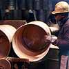 Worker warming himself at a fire in an oildrum reconditioning and manufacturing plant in Memphis TN.