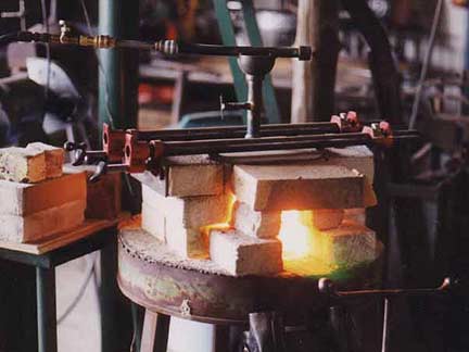 A simple stack of bricks makes a versatile and simple design as it can be easily rearranged according to the size of the piece. The slab underneath consists of a 1" layer of plastic refractory cast on top of 3" of used ceramic fiber leftovers, sitting in the bottom of an old oil drum.