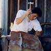 Worker warming himself at a fire in an oildrum reconditioning and manufacturing plant in Memphis TN.