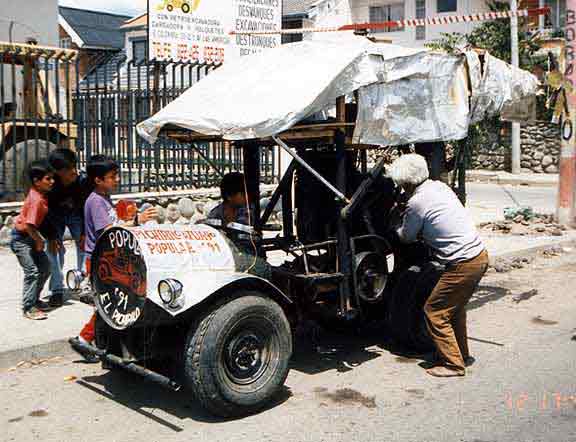 Little Car I am the hood of a little car, and I think I used to be an oildrum before. My owner is driving across Ecuador with me. He built the car himself. (Photo by Klaus Sparer, Cuenca/Ecuador 1991)