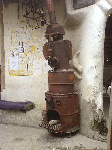 Satanic Fire Place I turned into a voracious fireplace at the "Prohibido Centro Cultural" in Cuenca, Ecuador. It's a weird place here, they think they worship the devil. Picture of little drummer on top of stove.